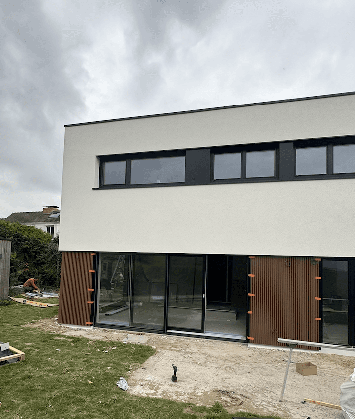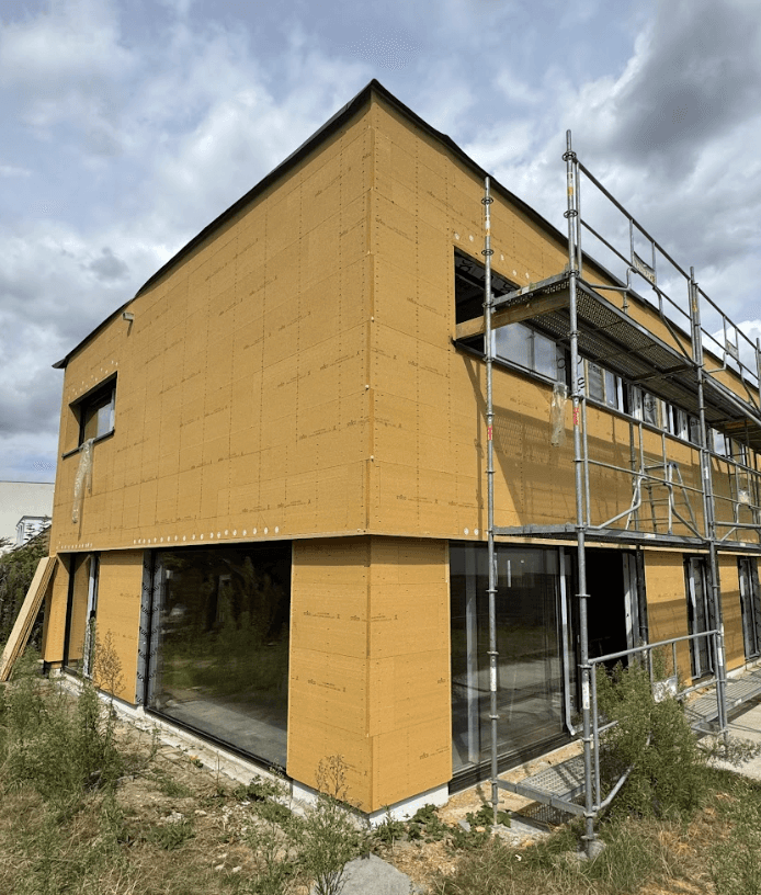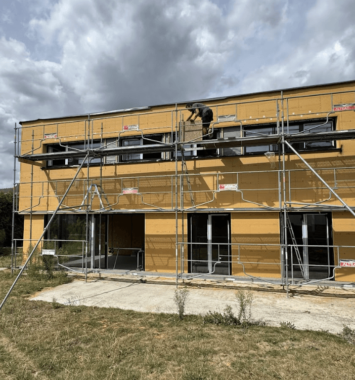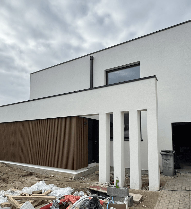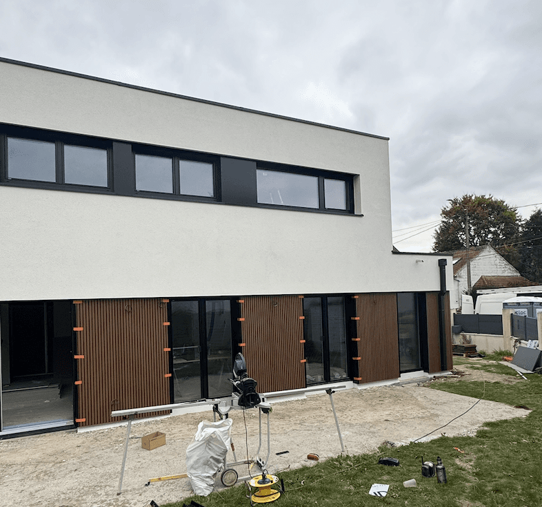 Chantier à Marcq en Baroeul d'une maison moderne neuve. Fibre de bois de 40mm + enduit rpe