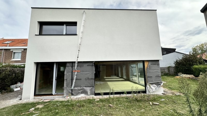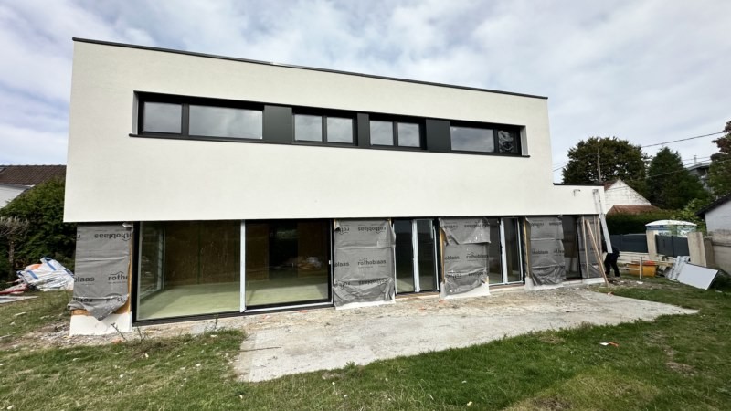 Chantier à Marcq en Baroeul d'une maison moderne neuve. Fibre de bois de 40mm + enduit rpe